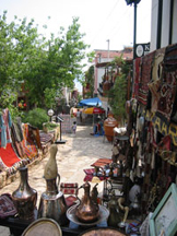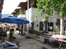 Kalkan is a village that has almost grown into a town, built on the side of the Taurus mountains and sweeping down narrow cobbled streets to a small, picturesque harbour. With its multitude of small, atmospheric restaurants which offer delicious Turkish dishes and a wide range of international cuisine, the village has a warm and welcoming feeling to it. There are a few bars in Kalkan, both on the harbour and in the centre, but none are intrusive, and the bar staff are always friendly and eager to please. Bourgainvillea blossoms, trailing the white walls of the Turkish houses, give the pretty lanes and houses a magnificent finish. A painter's paradise! Kalkan is situated half an hour from Kas, and about one hour from Fethiye, Fethiye being the larger of the 2 towns, with its massive market on Tuesdays, impressive mariner, rock tombs, castle, and wide selection of shops. Many of the market vendors move between the markets in Fethiye, Kalkan and Kas, so be prepared to bargain well in Kalkan which tends to be the more sedate, yet more expensive of the markets. Inside Kalkan, there are many select shops, restaurants and cafes. The old part of Kalkan, on the eastern side of the village, is full of charm and well worth exploring, with its old houses and local residents.